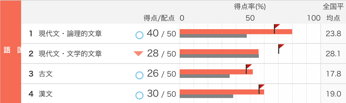 評論で高得点を取れたのがものすごく嬉しかったです。(ゼロから覚醒で頑張ったので)あとは小説と古文です。特に古文なんかは2次試験で記述で問われるのでマークでは満点を取る勢いでなくては・・・