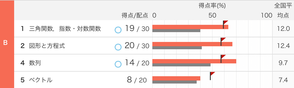 ⅡBはベクトルの対策不足がとても目立ちました。と言うのも復習をしていなかったために、問題の途中で内積を求めるのが出てきた時点で詰みました。逆に苦手な図形と方程式は重点的に対策したので得点できたと思います。