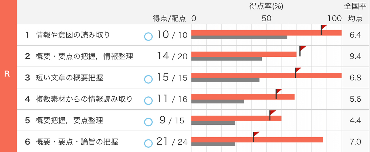 リーディングは今回受験した教科の中で世界史と並び最も高い得点がでました。5番の問題以外はかなり取れていて最後の6番も集中力が続いてよかったと思います。単語力をもっと鍛えて、本番は9割目指したいです。